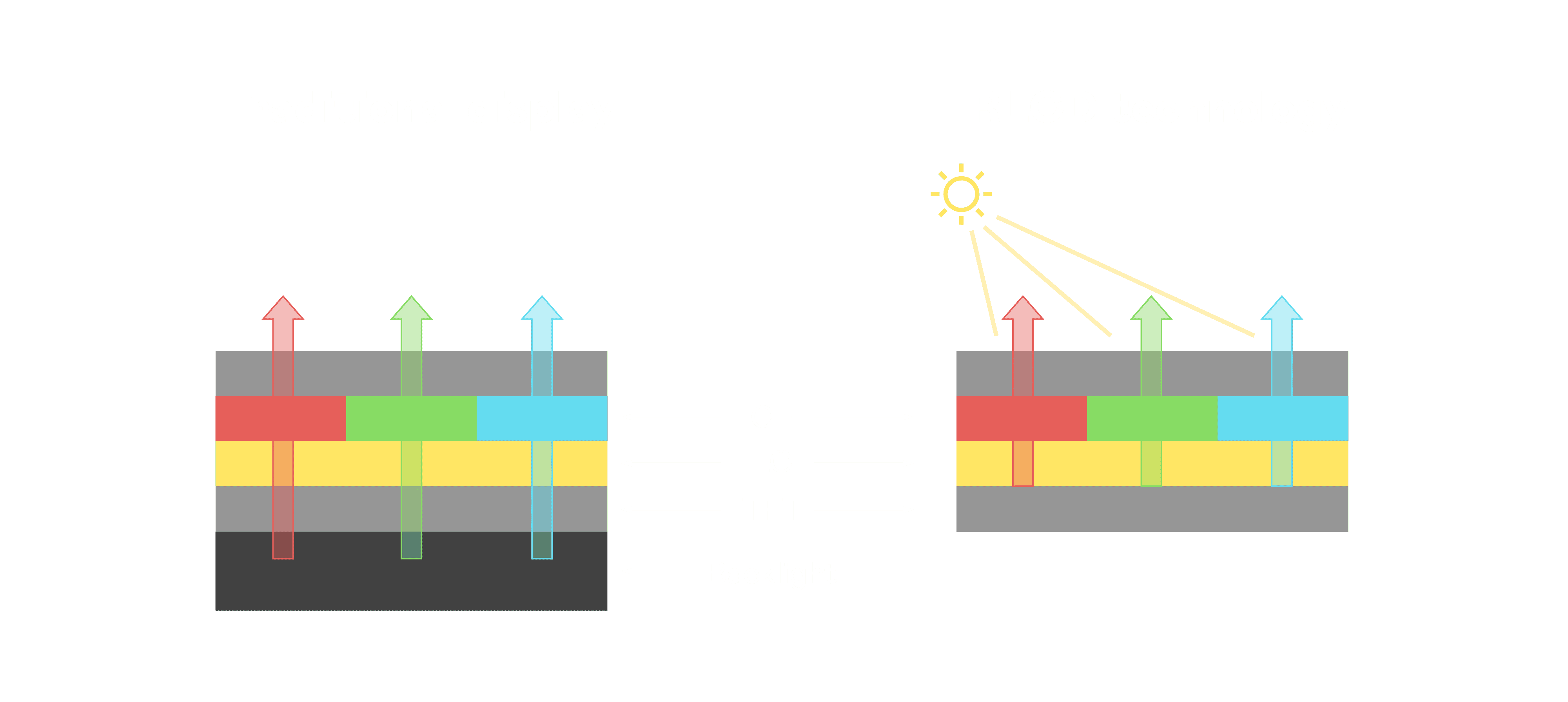 与传统需搭配背光单元的液晶显示相比,,,,反射式液晶技术不仅更省电、、、、更轻薄,,,,且即便在艳阳下仍能清晰显示。。。。此外,,少了背光单元,,,,也大幅降低了 LED 蓝光伤害眼睛的疑虑。。。。